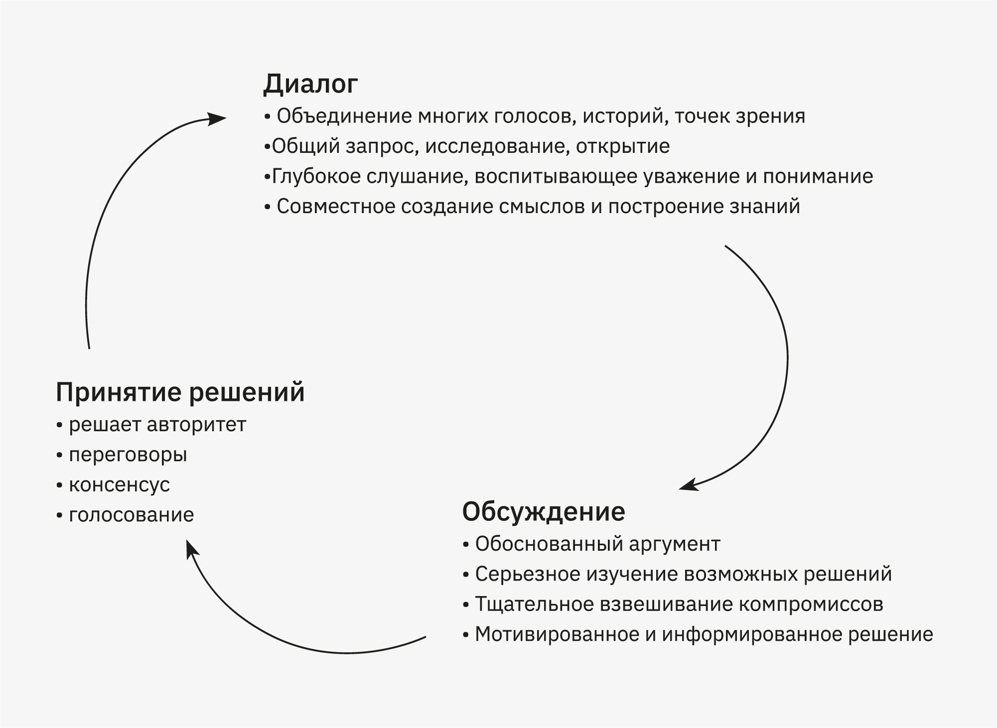 Как красноречиво заявил один практик, «диалог — это не физический акт разговора. Это развертывание мыслей».59 На одном уровне этот принцип касается качества взаимодействия в процессе диалога. Он отличает легитимный диалог от «фальшивого», где общение носит односторонний характер, а также от дебатов или переговоров, где участники сосредотачиваются лишь на том, чтобы как можно больше выиграть для себя.
