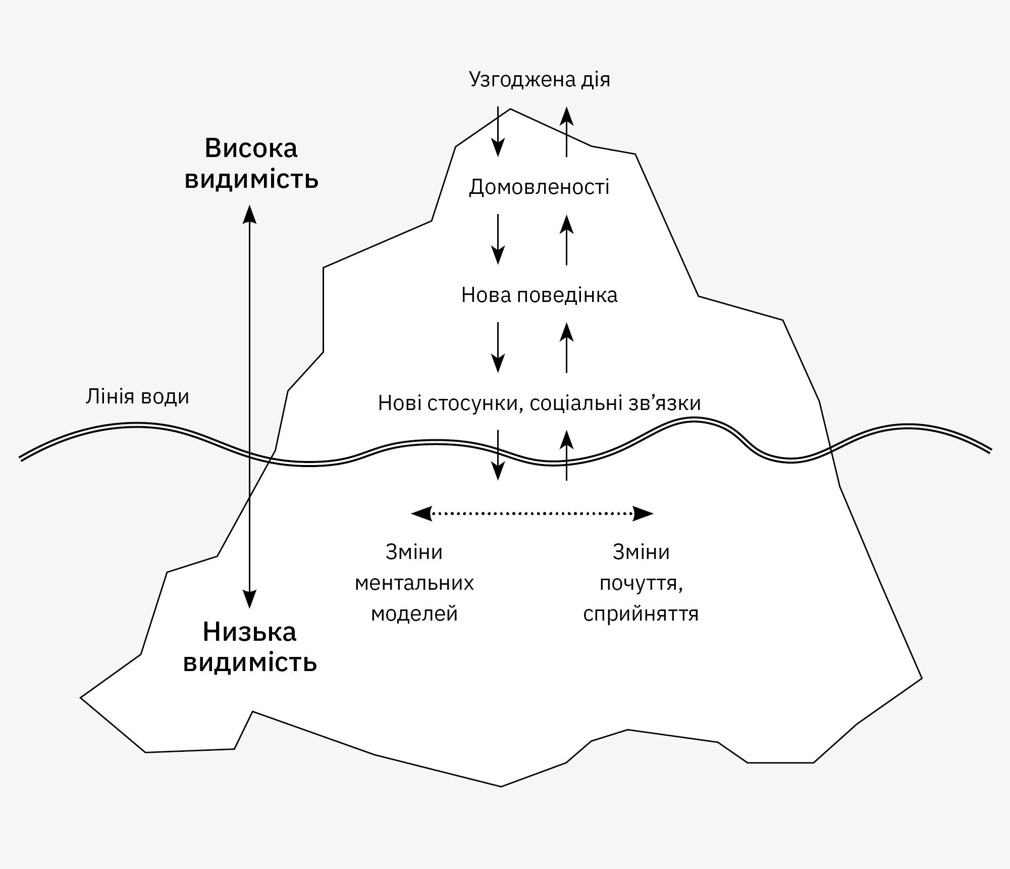 Багато хто використовує аналогію з айсбергом, щоб передати думку про те, що часто видимі характеристики сутності або явища є лише невеликою частиною його сукупності, і що важливо усвідомлювати ті аспекти, які ми не можемо побачити відразу. Ми використовуємо цю модель «айсберга змін», розроблену Катрін Койфер та Отто Шармером, щоб наголосити на тому, що видимі й невидимі зміни взаємопов’язані та часто взаємозалежні.81 На найглибшому рівні зрушення в почуттях і сприйняттях відкривають людям можливість змін.