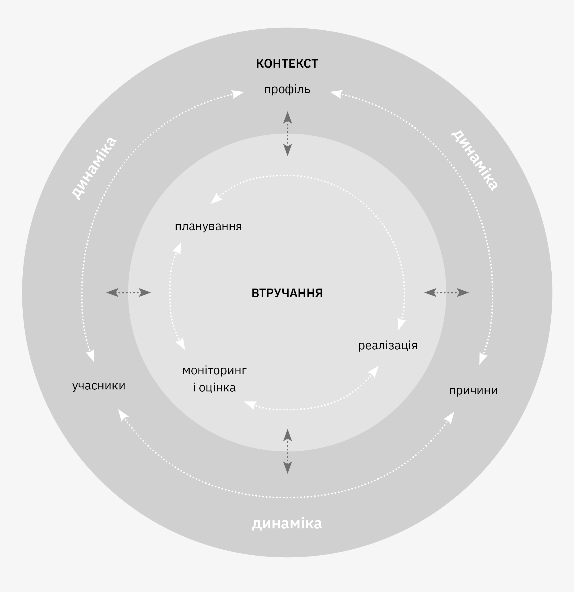 Внутрішнє коло представляє проектний цикл пропонованого втручання, організований як компоненти планування, реалізації та моніторингу й оцінки.