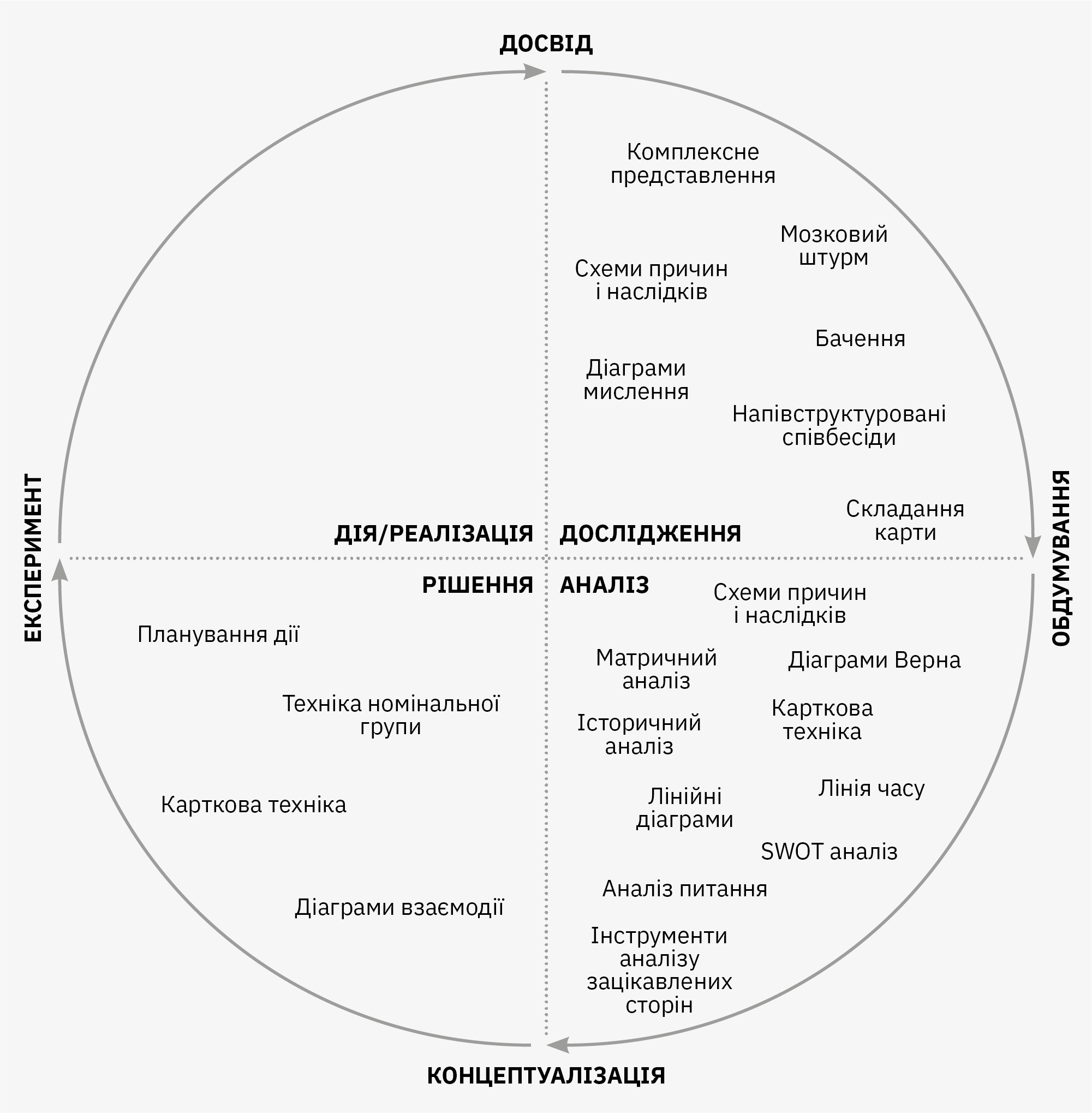 Цикл навчання відслідковує, як люди переходять від сфери дії, яка дає досвід, до спостереження та роздумів, абстрактної концептуалізації нового плану дій та тестування цього плану шляхом експериментів із подальшими діями. На рисунку 2.2.2 видно, наскільки різні інструменти мають відношення до різних етапів цього циклу, а також до конкретних видів дослідження, аналізу та прийняття рішень, що є частиною завдання оцінки в діалоговій роботі. Як і Збірник матеріалів, Портал містить огляд інструментів, які можуть бути корисними для практиків у процесі діалогу.