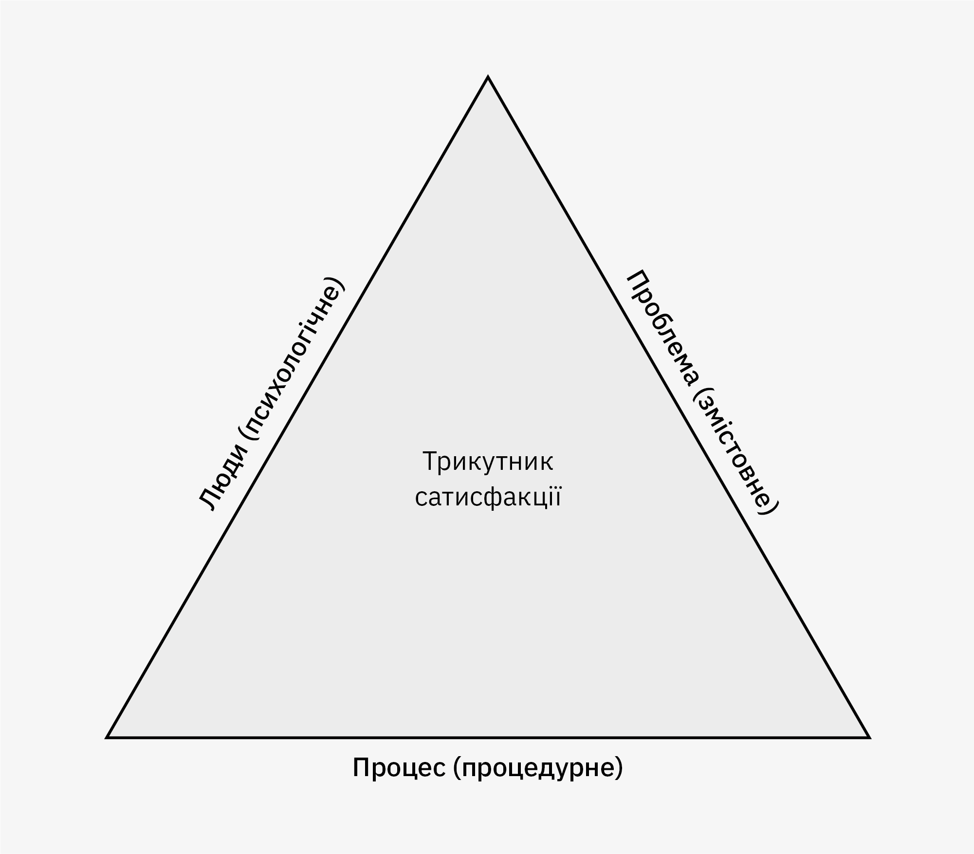 У процесі розробки також важливо зберегти збалансовану увагу на трьох найважливіших аспектах ініціативи діалогу, які визначатимуть її успіх — людях, проблемі та процесі. На рисунку 2.3.1 представлено «трикутник задоволення», розроблений Крістофером Муром з CDR Associates, щоб проілюструвати цей момент.119 Трикутник Мура — це інструмент для аналізу конфліктів, який розрізняє різні інтереси людей за типами ситуацій, для вирішення яких створюються діалоги. Це може допомогти практикам не забувати про характеристики якісної розробки.