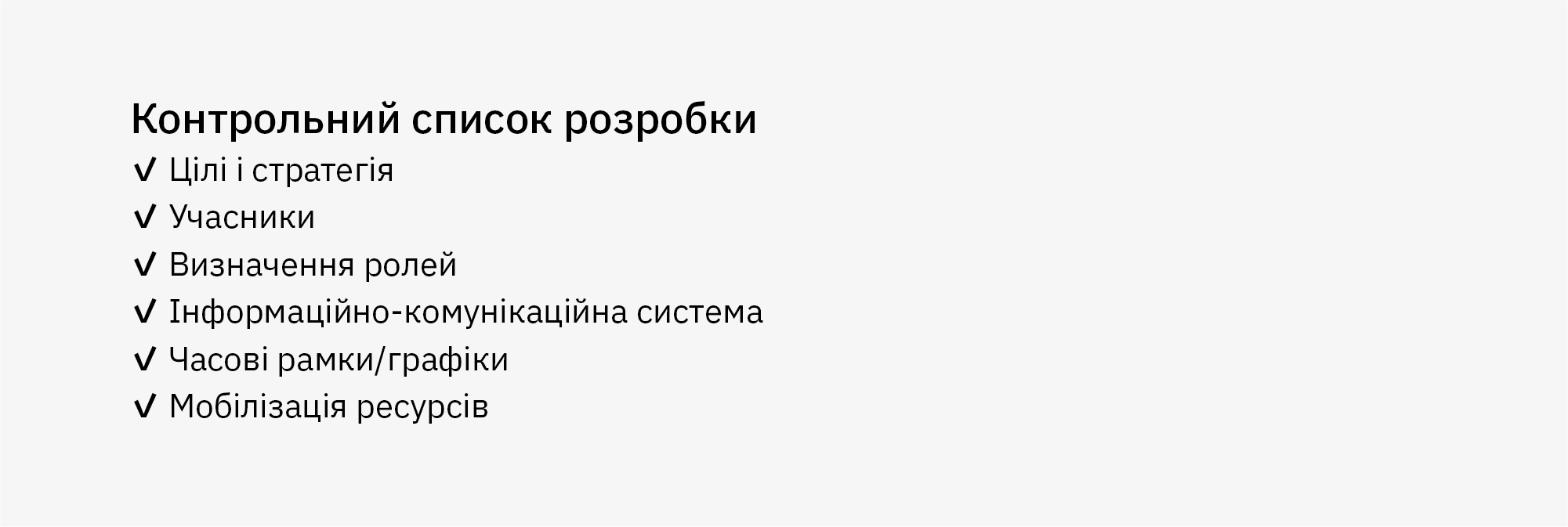 Ми пропонуємо наступний список для міркувань щодо комунікаційної стратегії як частини розробки процесу.