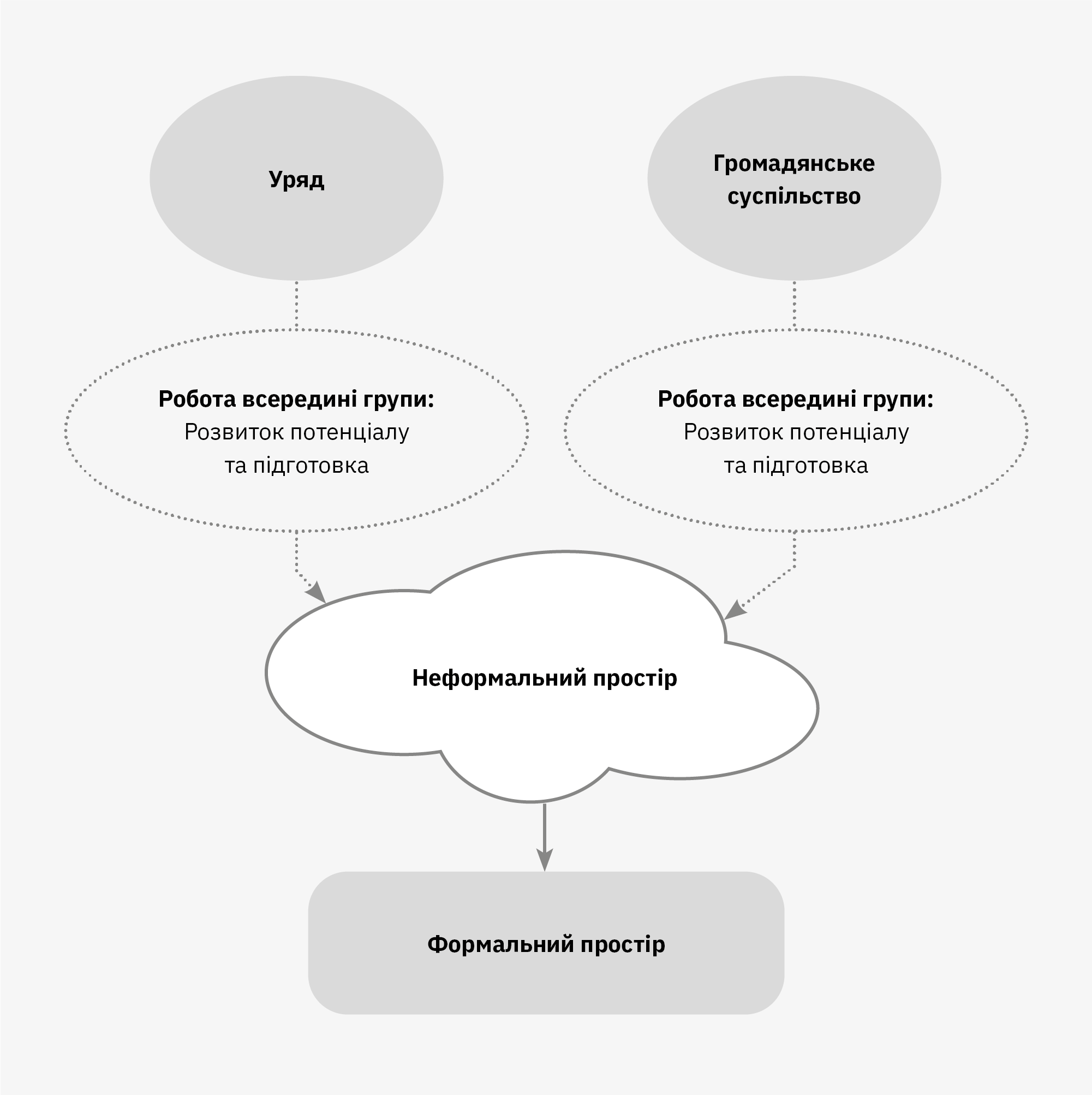 Робота всередині групи в неформальному просторі. Це може бути неофіційний діалог, який об’єднує кількох ініціативних членів поляризованих груп, щоб перевірити можливість більш офіційних зустрічей. Або, знову ж таки, така робота може включати навчальну програму, яка може забезпечити відносно незагрозливий спосіб об’єднати людей, — такий, у якому ризики менші, ніж у формальному просторі діалогу, але який дає їм відчуття, яким може бути діалоговий процес.