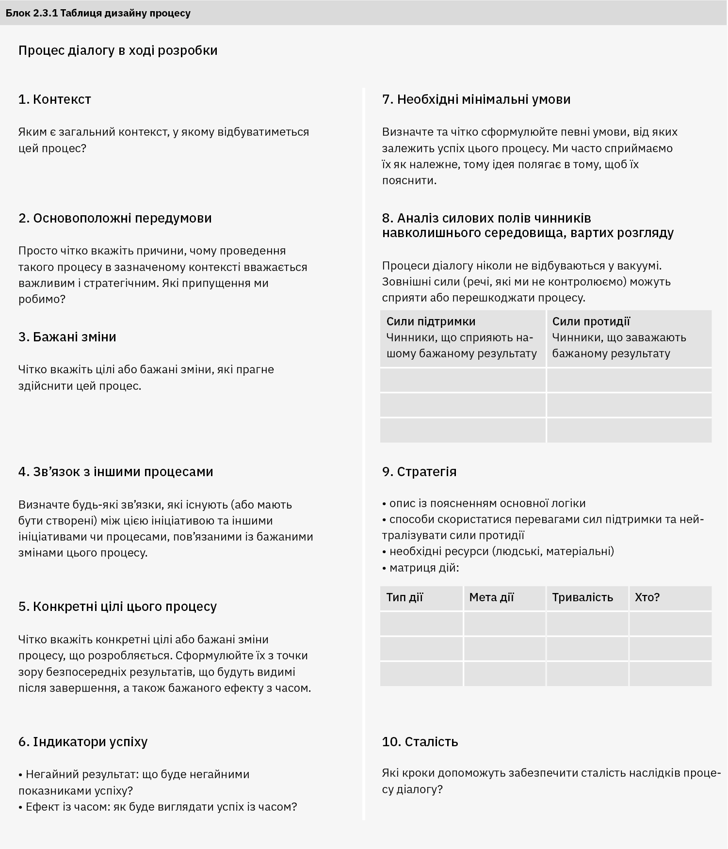 Таблиця дизайну процесу, показана в блоці 2.3.1, розроблена Філіпом Томасом для OAS/PROPAZ, пропонує основу для інтегрованого підходу до формулювання цілей та стратегії, спираючись на інформацію, розроблену на етапі дослідження. Вона містить вказівки щодо фіксації мислення, що лежить в основі дизайну. Серед іншого, пропонується продумати і задокументувати мислення щодо трьох основних будівельних блоків, як для моніторингу та оцінки, так і для постійного навчання та адаптації, які дизайн повинен підтримувати у процесі розгортання діалогу: теорія змін, конкретні цілі змін і визначення успіху.