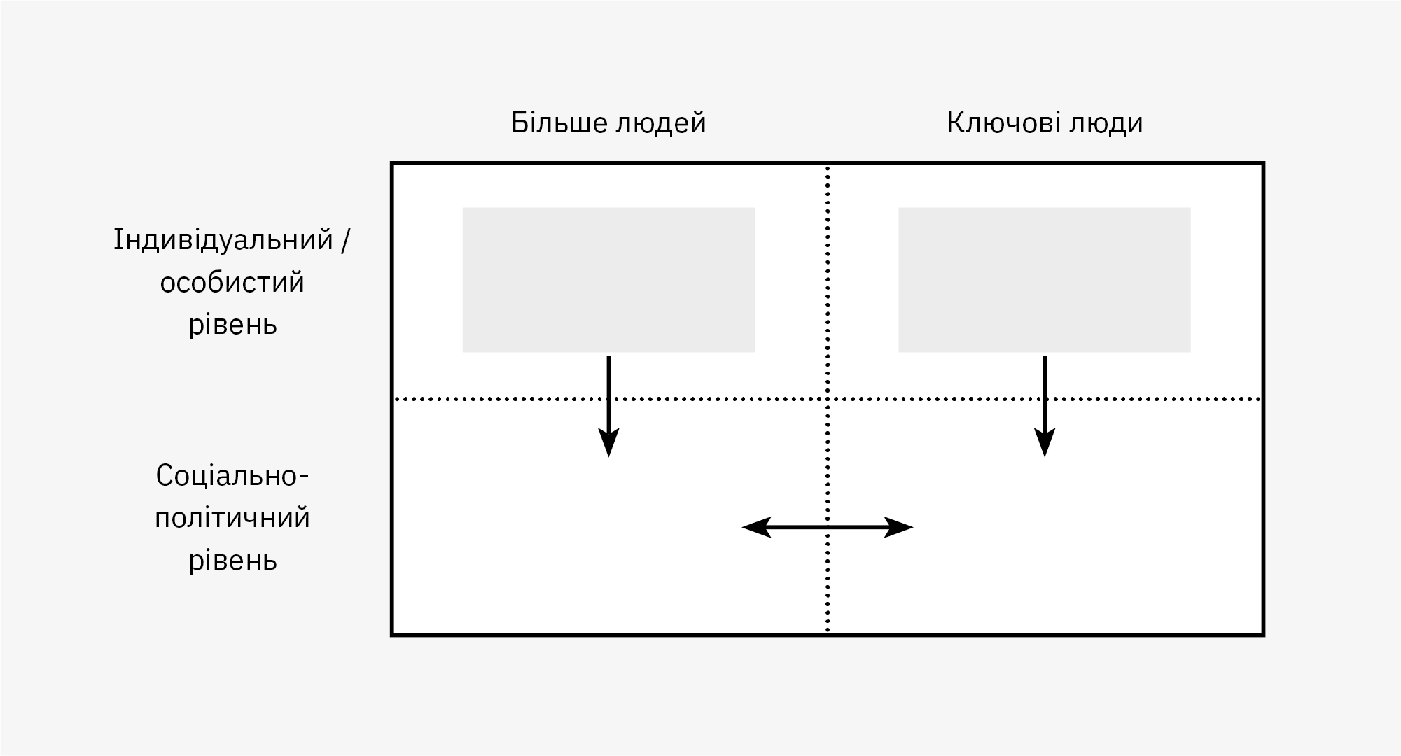 У праці Confronting War: Critical Lessons for Peace Practitioners, Мері Андерсон та Лара Олсон пропонують систему, яка може бути корисною при встановленні цілей. У ній розрізняються два рівні впливу: індивідуальний/особистий та соціально-політичний.122 Впливу на індивідуальному/особистому рівні недостатньо для досягнення цілей, визначених у додатку 1. Він повинен перетворитися на вплив на соціально-політичному рівні. Ось чотири способи, як це може статися, проілюстровані прикладами з трьох кейсів, представлених у частині 3 Посібника.