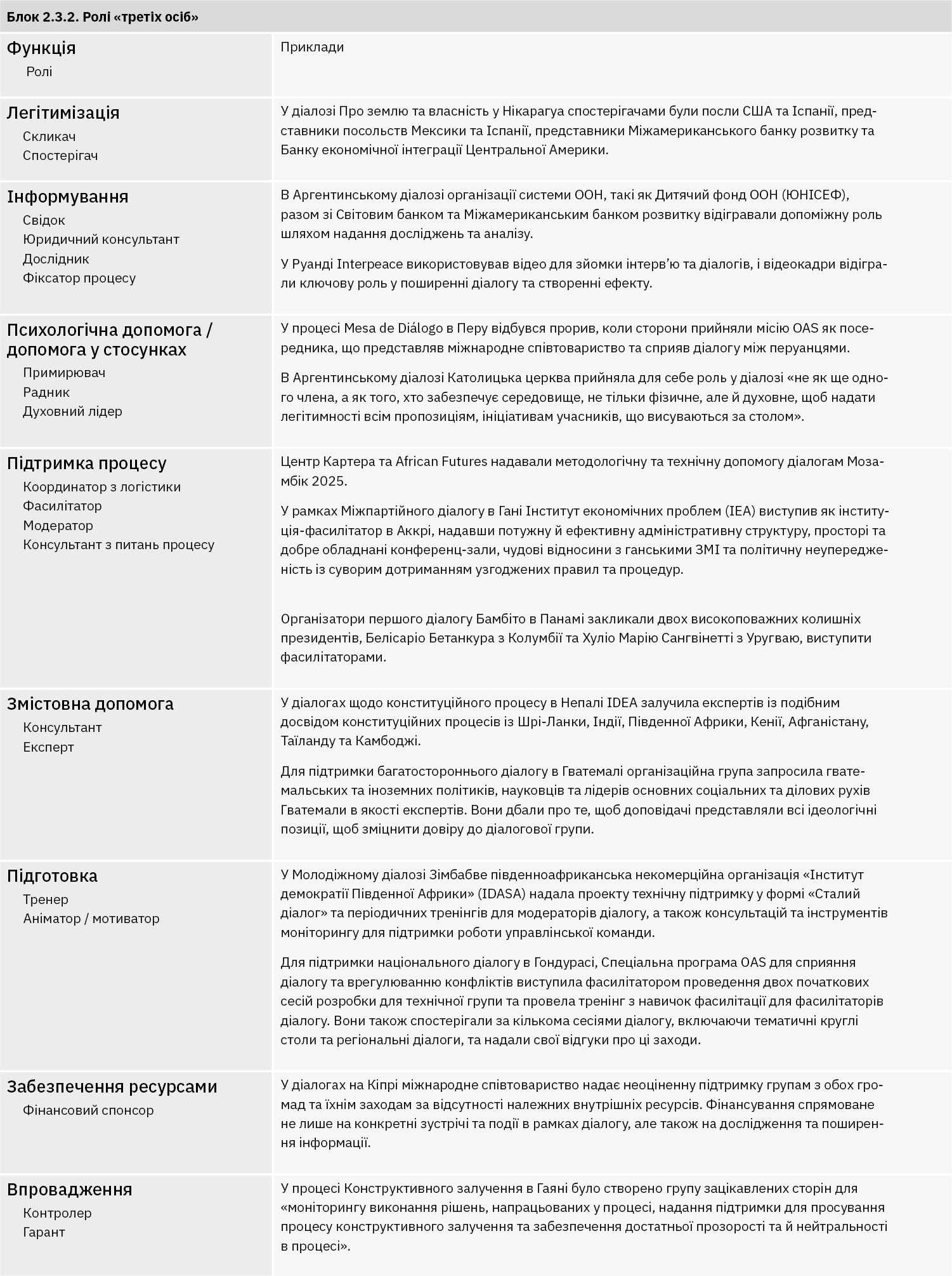 Люди та інституції можуть виконувати різноманітні ролі, щоб допомогти ініціативі діалогу в досягненні своїх цілей. Частина розробки процесу передбачає визначення того, які ролі необхідні і як їх можна виконувати. У списку у блоці 2.3.2 представлено вісім видів ролей, які можуть бути відведені третім особам. Приклади, взяті з кейсів, підготовлених для цього Посібника (додаток 1), надають пропозиції, як ці ролі можна реалізувати.