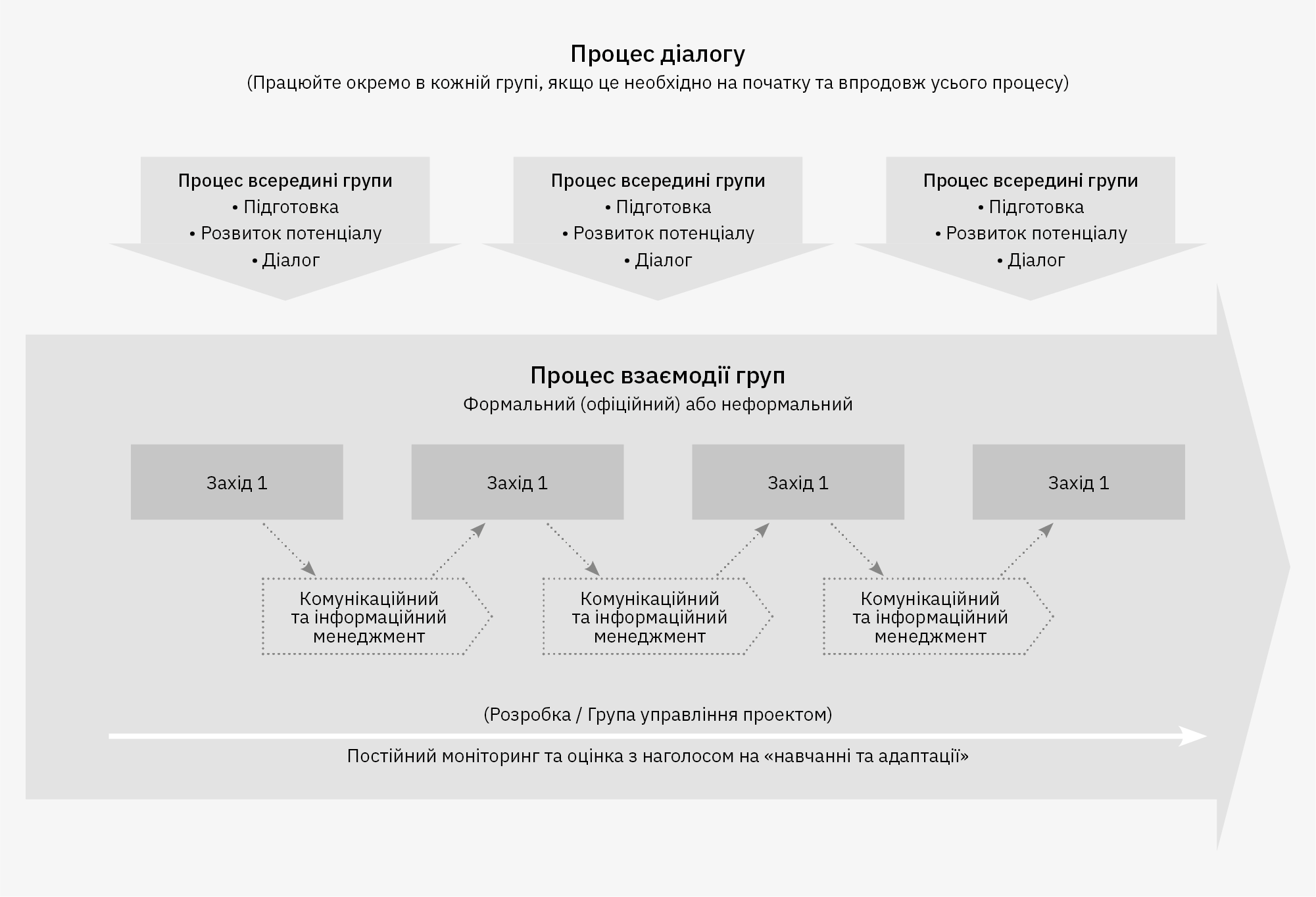 Процеси діалогу бувають різних форм і масштабів. Жоден окремий проект процесу не буде правильним за будь-яких різних обставин. Навпаки, існує ціла низка інструментів процесу на вибір, залежно від культурного та політичного контексту кожного випадку. Оцінка, проведена на етапі дослідження, надасть інформацію, яка допоможе здійснити такий вибір. Як і на етапі дослідження, прийняття діалогового підходу для розробки та залучення інших призведе до збільшення ймовірності позитивного результату як за рахунок розширення інформаційної бази, так і завдяки створенню почуття відповідальності серед ключових груп зацікавлених сторін.