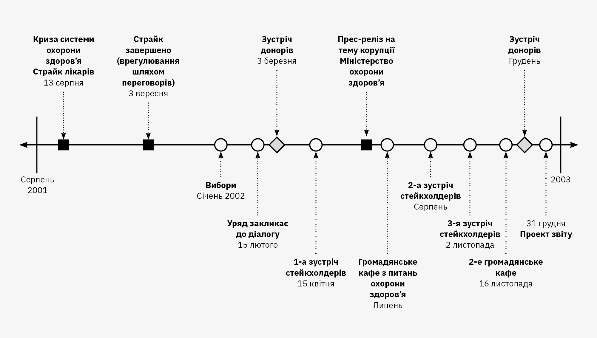 Накресліть лінію часу для досліджуваного періоду, а потім визначте ключові періоди та події на цій лінії щодо трьох найбільш важливих параметрів: контексту, процесу діалогу та роботи команди проекту. На рисунку 2.5.2 показано, як може виглядати така лінія часу. Використовуйте її для огляду трьох ключових параметрів.