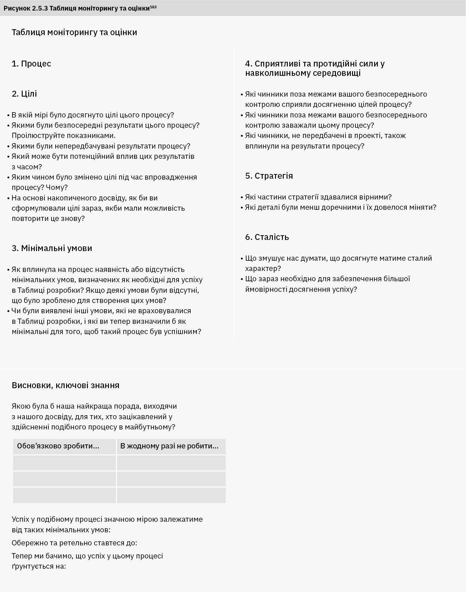 Таблиця з моніторингу та оцінки на рисунку 2.5.3 є додатковою до Таблиці розробки процесу, представленої у главі 2.3, і призначена для структурування остаточної оцінки процесу діалогу. Запитання в цій таблиці можуть допомогти тим, хто бере участь у розробці та впровадженні процесу, фіксувати не лише результати, але й те, як розгортався процес, використовувані стратегії та основні припущення, на яких він базувався.