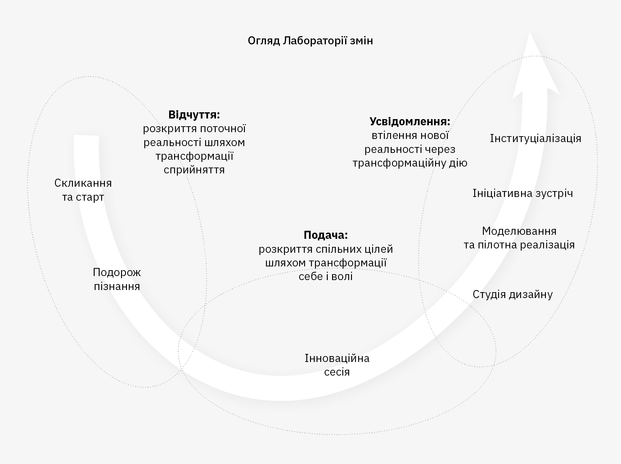 Лабораторія змін — процес діалогових змін, що здійснюється за участю багатьох зацікавлених сторін, і покликаний створити спільне зобов’язання та колективне розуміння, необхідні для проривних рішень складних соціальних проблем. Кожна лабораторія змін створюється навколо певної суспільної проблеми, очевидного рішення якої немає. Вона скликається однією або кількома організаціями, які прагнуть здійснити зміни та усвідомлюють, що не можуть вирішити цю проблему самостійно. Організатор (організатори) об’єднує 25–35 ключових зацікавлених сторін у питанні, представляючи «мікросвіт» проблемної системи. Ці люди повинні бути впливовими, різноманітними, орієнтованими на зміну системи та відкритими для зміни самих себе. Процес, який вони разом проходять у лабораторії змін, черпає натхнення в «U-процесі», розробленому спільно Отто Шармером та Джозефом Яворським (див. рисунок нижче216). Для отримання додаткової інформації див.: edx.org.